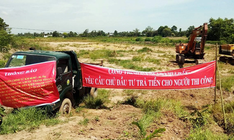 Nhà thầu ngừng thi công, treo khẩu hiệu đòi chủ đầu tư thanh toán. Ảnh: Annan .
