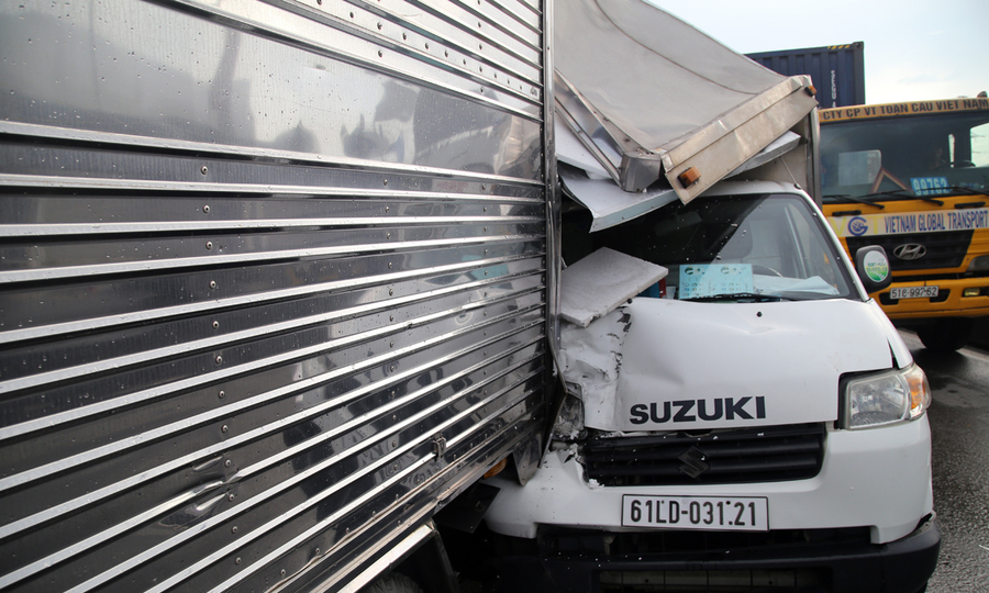Một chiếc xe tải cúi đầu khi đâm vào phía sau xe phía trước. Ảnh: Đinh Vân .